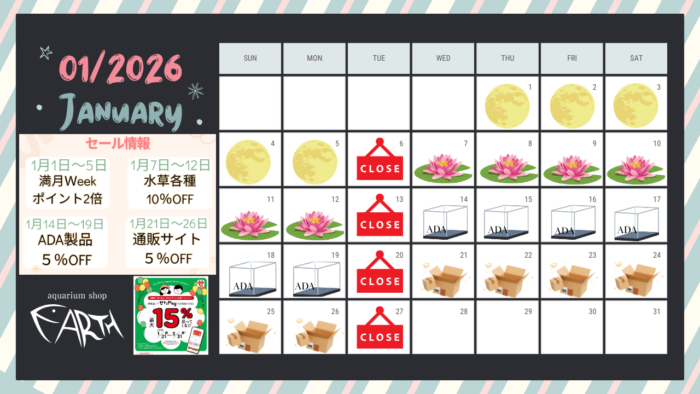 ※定休日(6日・13日・20日・27日)はお休みとなります。 2026年のアクアリウムは、EARTHと一緒に良いスタートを。